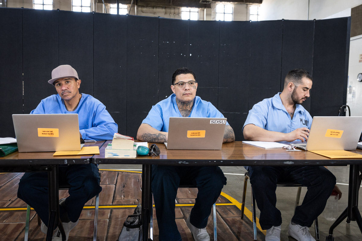 These images are of two academic classes in the VISTA (Valuing Incarcerated Scholars through Academia) program run by San Diego State University; this is a two-year program to receive a Bachelor of Arts completion degree. Seen here are: