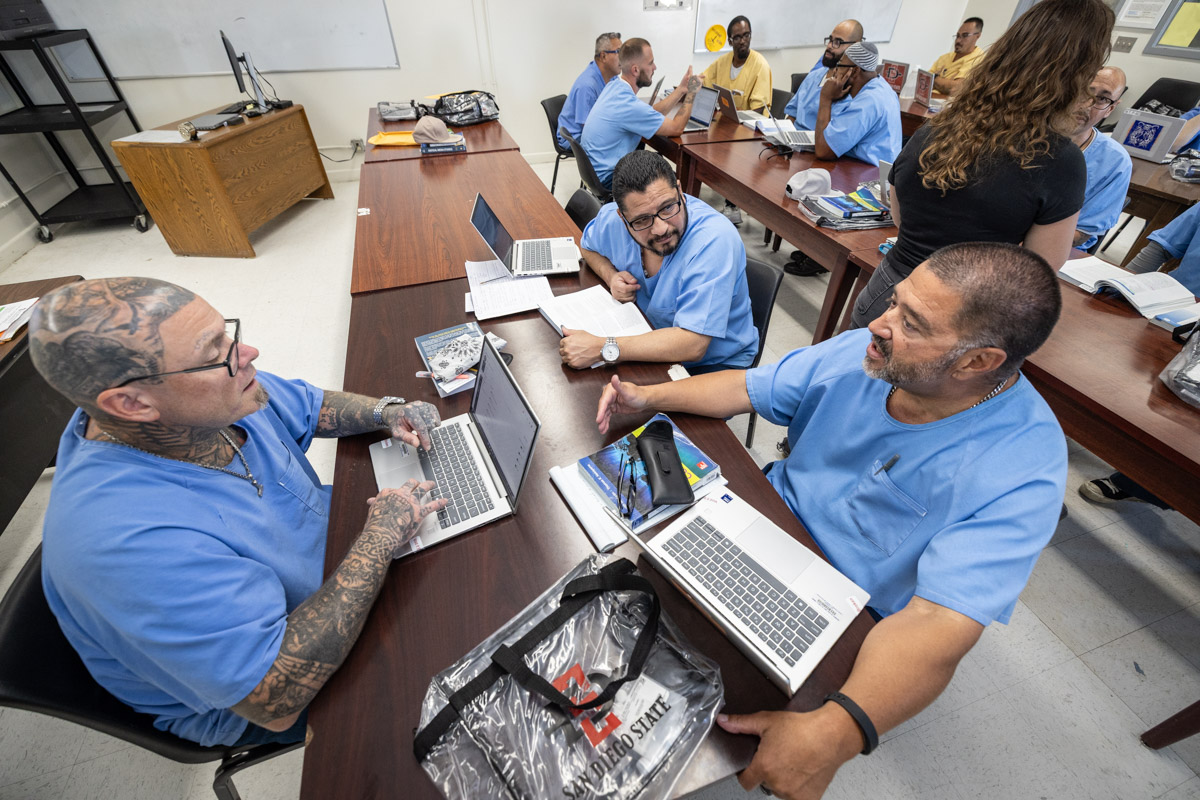 These images are of two academic classes in the VISTA (Valuing Incarcerated Scholars through Academia) program run by San Diego State University; this is a two-year program to receive a Bachelor of Arts completion degree. Seen here are: