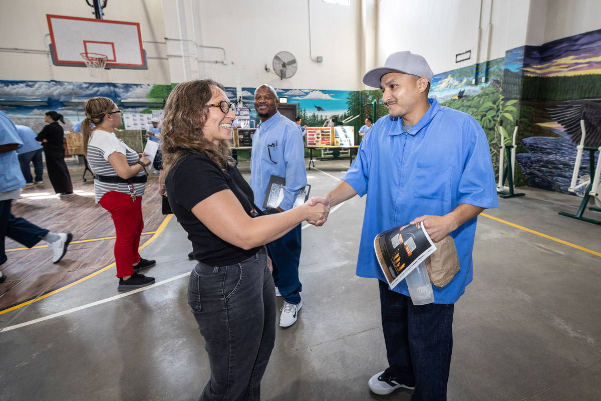 These images are of Open House events on two yards, showcasing the VISTA (Valuing Incarcerated Scholars Through Academia) program run by San Diego State University at Centinela State Prison (CEN); this is a two-year Bachelor of Arts completion degree. Current VISTA students created posters featuring their research studies, and are showing them to men who are interested in joining this program. The existing students also joined a panel discussion, during which they fielded questions about their experiences in the program.