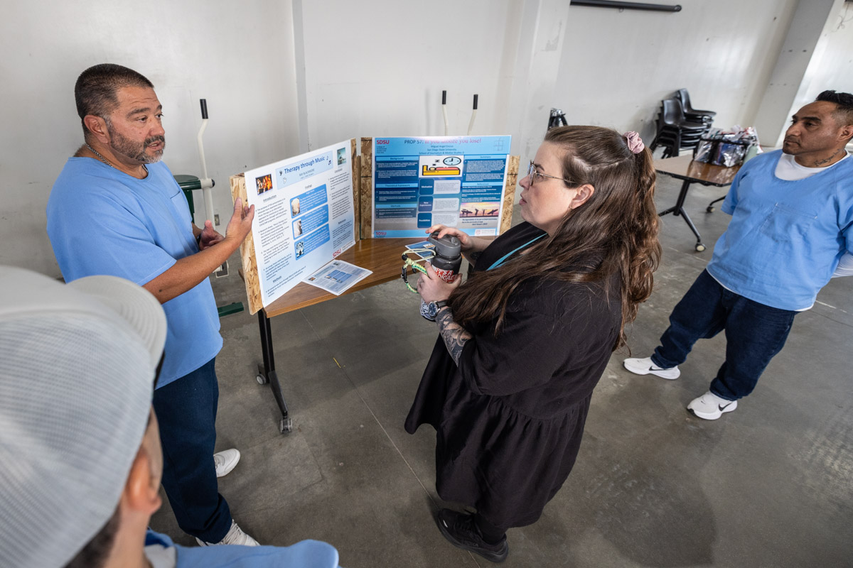 These images are of Open House events on two yards, showcasing the VISTA (Valuing Incarcerated Scholars Through Academia) program run by San Diego State University at Centinela State Prison (CEN); this is a two-year Bachelor of Arts completion degree. Current VISTA students created posters featuring their research studies, and are showing them to men who are interested in joining this program. The existing students also joined a panel discussion, during which they fielded questions about their experiences in the program.