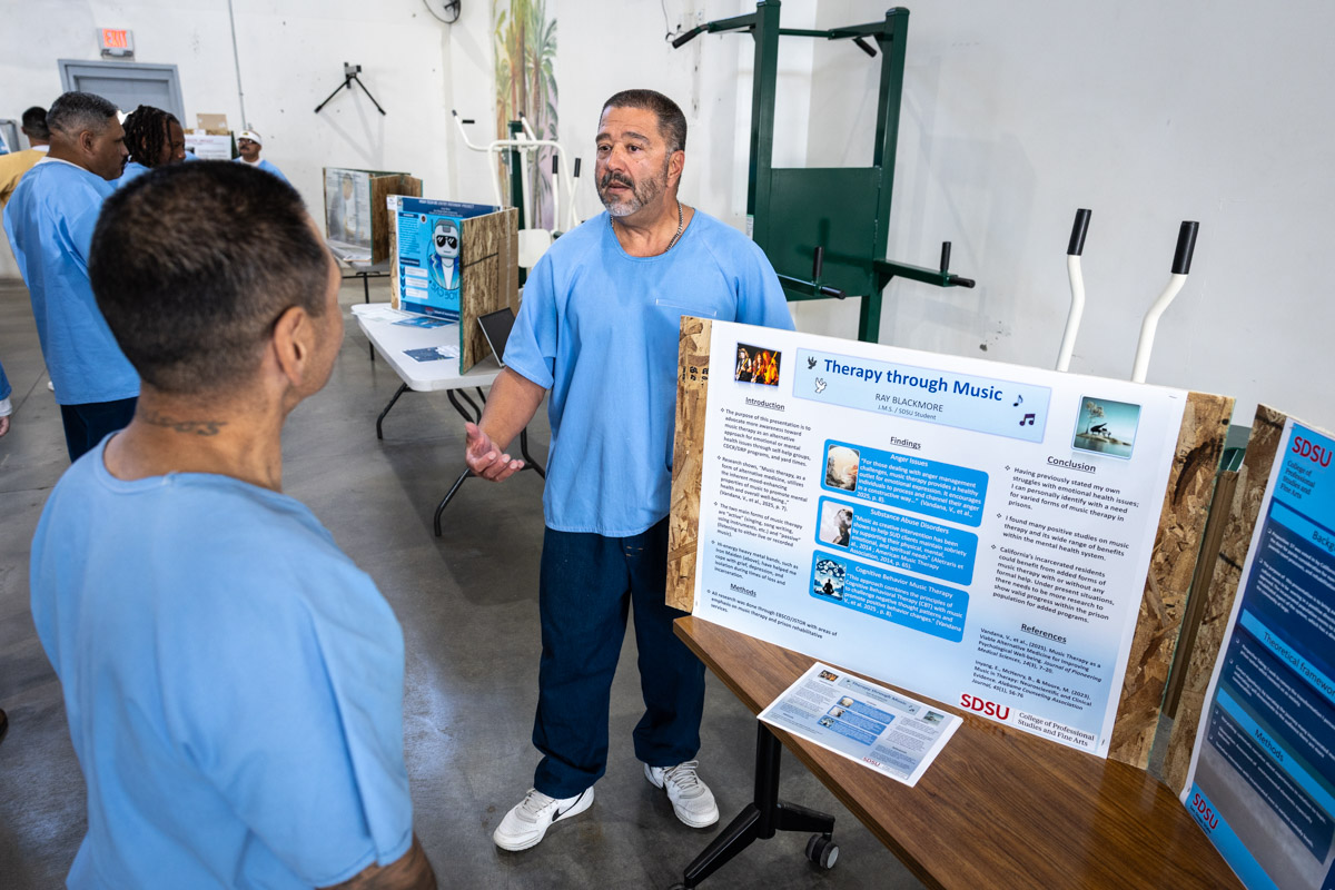 These images are of Open House events on two yards, showcasing the VISTA (Valuing Incarcerated Scholars Through Academia) program run by San Diego State University at Centinela State Prison (CEN); this is a two-year Bachelor of Arts completion degree. Current VISTA students created posters featuring their research studies, and are showing them to men who are interested in joining this program. The existing students also joined a panel discussion, during which they fielded questions about their experiences in the program.