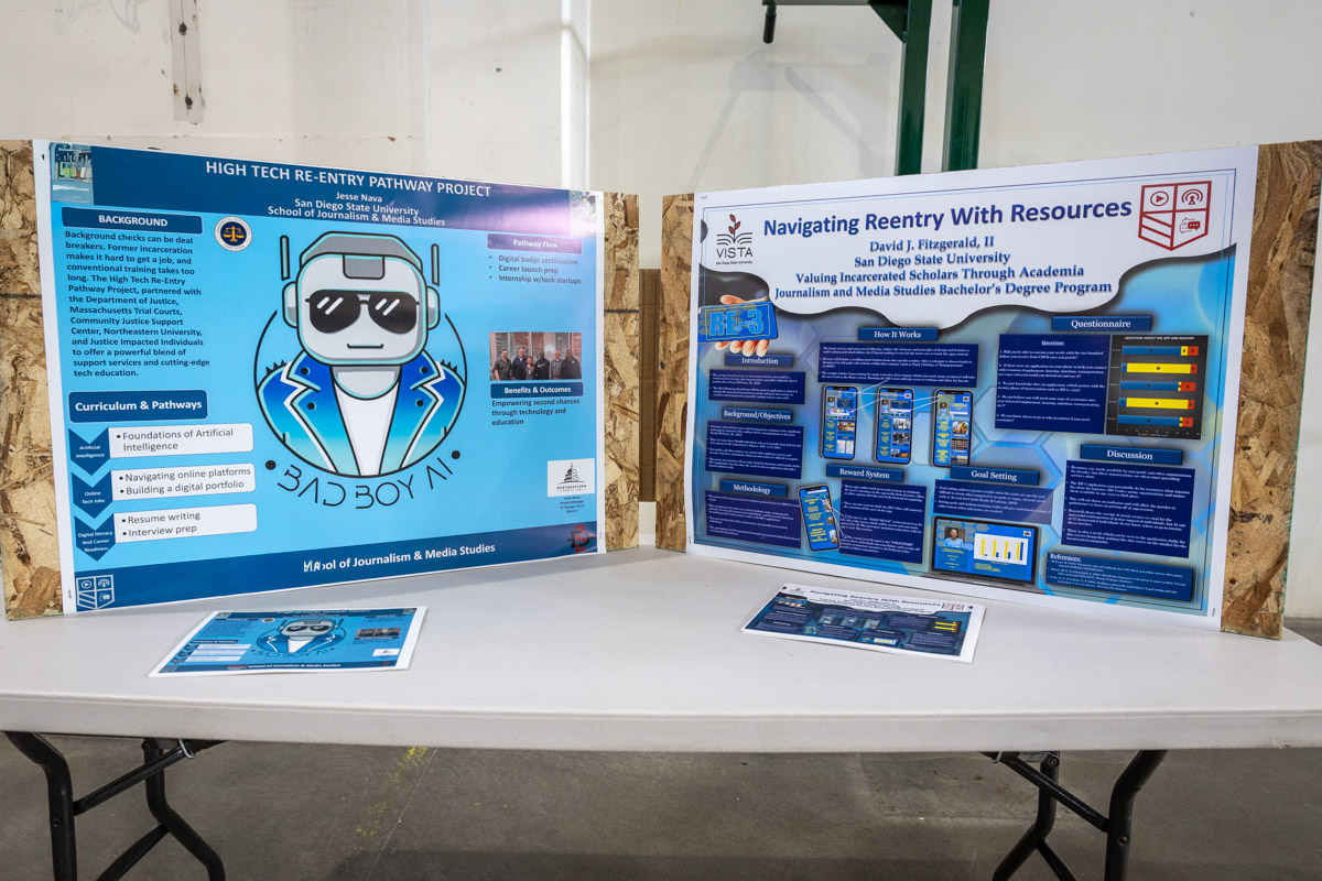 These images are of Open House events on two yards, showcasing the VISTA (Valuing Incarcerated Scholars Through Academia) program run by San Diego State University at Centinela State Prison (CEN); this is a two-year Bachelor of Arts completion degree. Current VISTA students created posters featuring their research studies, and are showing them to men who are interested in joining this program. The existing students also joined a panel discussion, during which they fielded questions about their experiences in the program.