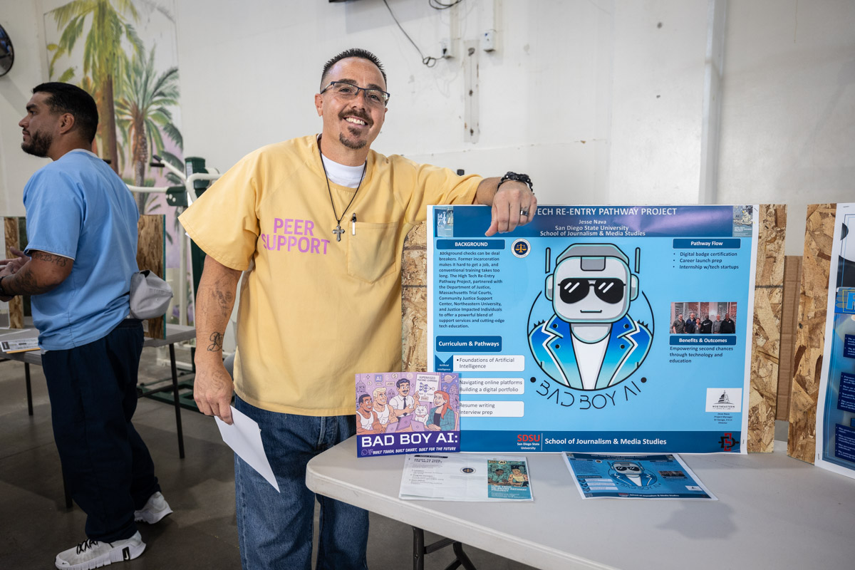 These images are of Open House events on two yards, showcasing the VISTA (Valuing Incarcerated Scholars Through Academia) program run by San Diego State University at Centinela State Prison (CEN); this is a two-year Bachelor of Arts completion degree. Current VISTA students created posters featuring their research studies, and are showing them to men who are interested in joining this program. The existing students also joined a panel discussion, during which they fielded questions about their experiences in the program.