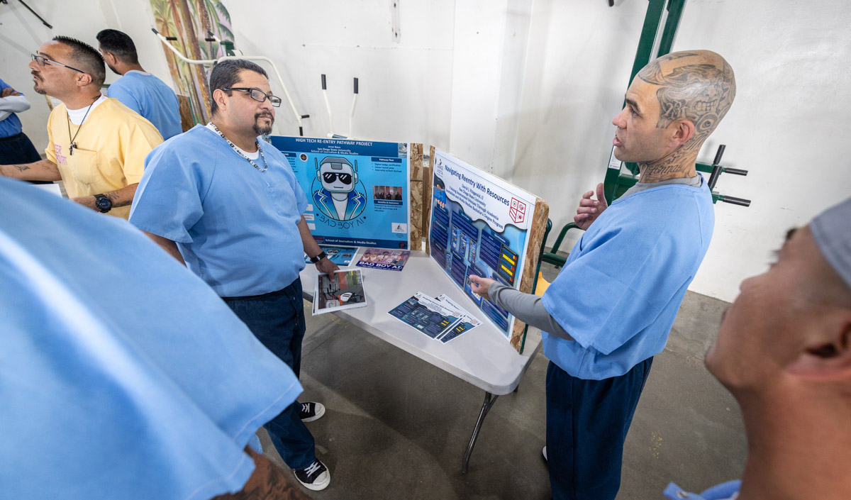 These images are of Open House events on two yards, showcasing the VISTA (Valuing Incarcerated Scholars Through Academia) program run by San Diego State University at Centinela State Prison (CEN); this is a two-year Bachelor of Arts completion degree. Current VISTA students created posters featuring their research studies, and are showing them to men who are interested in joining this program. The existing students also joined a panel discussion, during which they fielded questions about their experiences in the program.