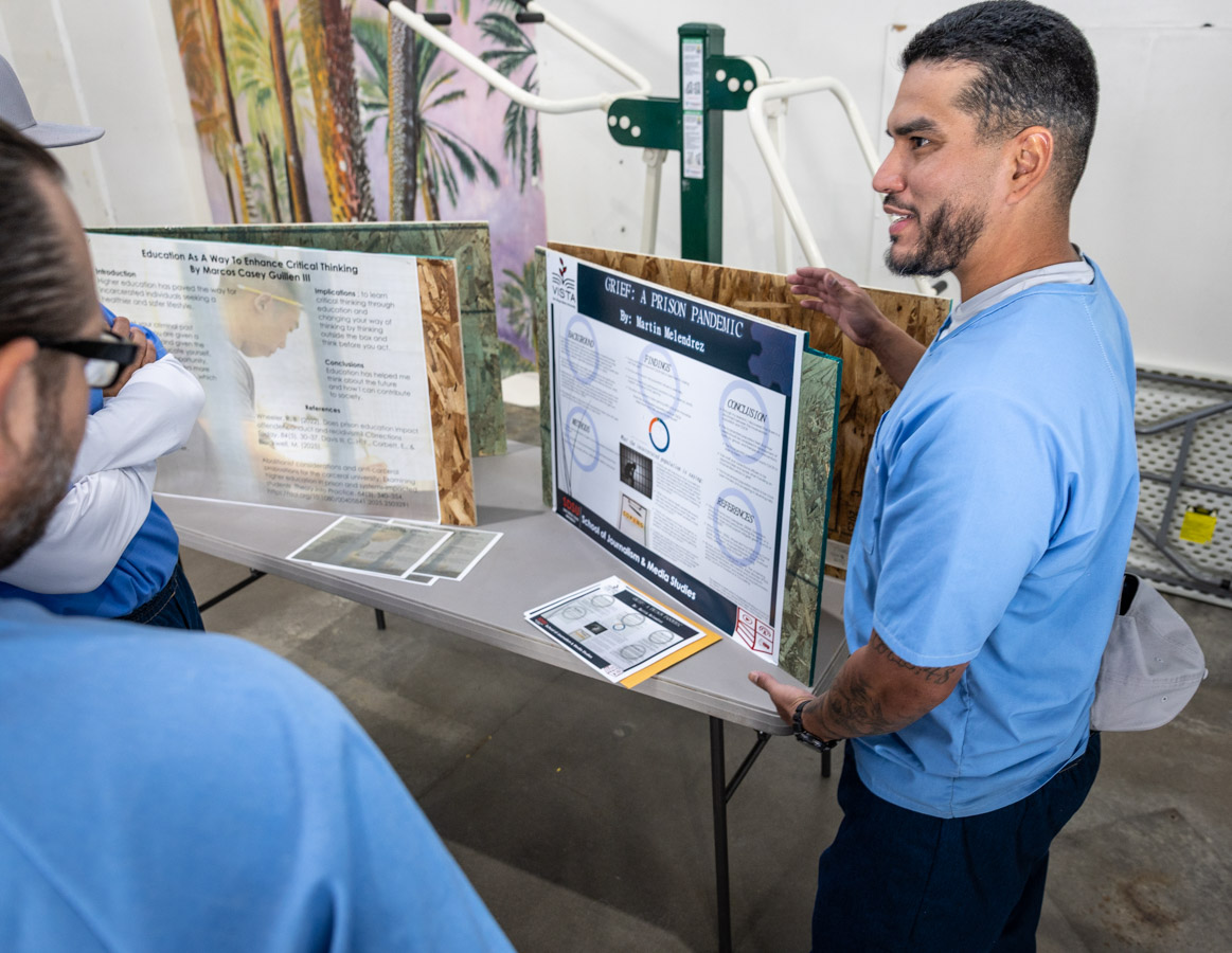 These images are of Open House events on two yards, showcasing the VISTA (Valuing Incarcerated Scholars Through Academia) program run by San Diego State University at Centinela State Prison (CEN); this is a two-year Bachelor of Arts completion degree. Current VISTA students created posters featuring their research studies, and are showing them to men who are interested in joining this program. The existing students also joined a panel discussion, during which they fielded questions about their experiences in the program.