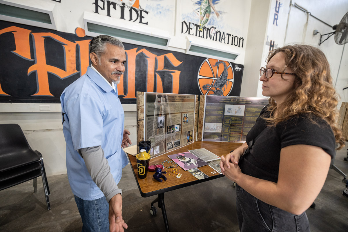 These images are of Open House events on two yards, showcasing the VISTA (Valuing Incarcerated Scholars Through Academia) program run by San Diego State University at Centinela State Prison (CEN); this is a two-year Bachelor of Arts completion degree. Current VISTA students created posters featuring their research studies, and are showing them to men who are interested in joining this program. The existing students also joined a panel discussion, during which they fielded questions about their experiences in the program.