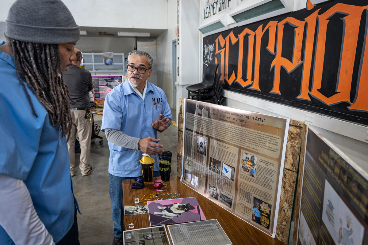 These images are of Open House events on two yards, showcasing the VISTA (Valuing Incarcerated Scholars Through Academia) program run by San Diego State University at Centinela State Prison (CEN); this is a two-year Bachelor of Arts completion degree. Current VISTA students created posters featuring their research studies, and are showing them to men who are interested in joining this program. The existing students also joined a panel discussion, during which they fielded questions about their experiences in the program.