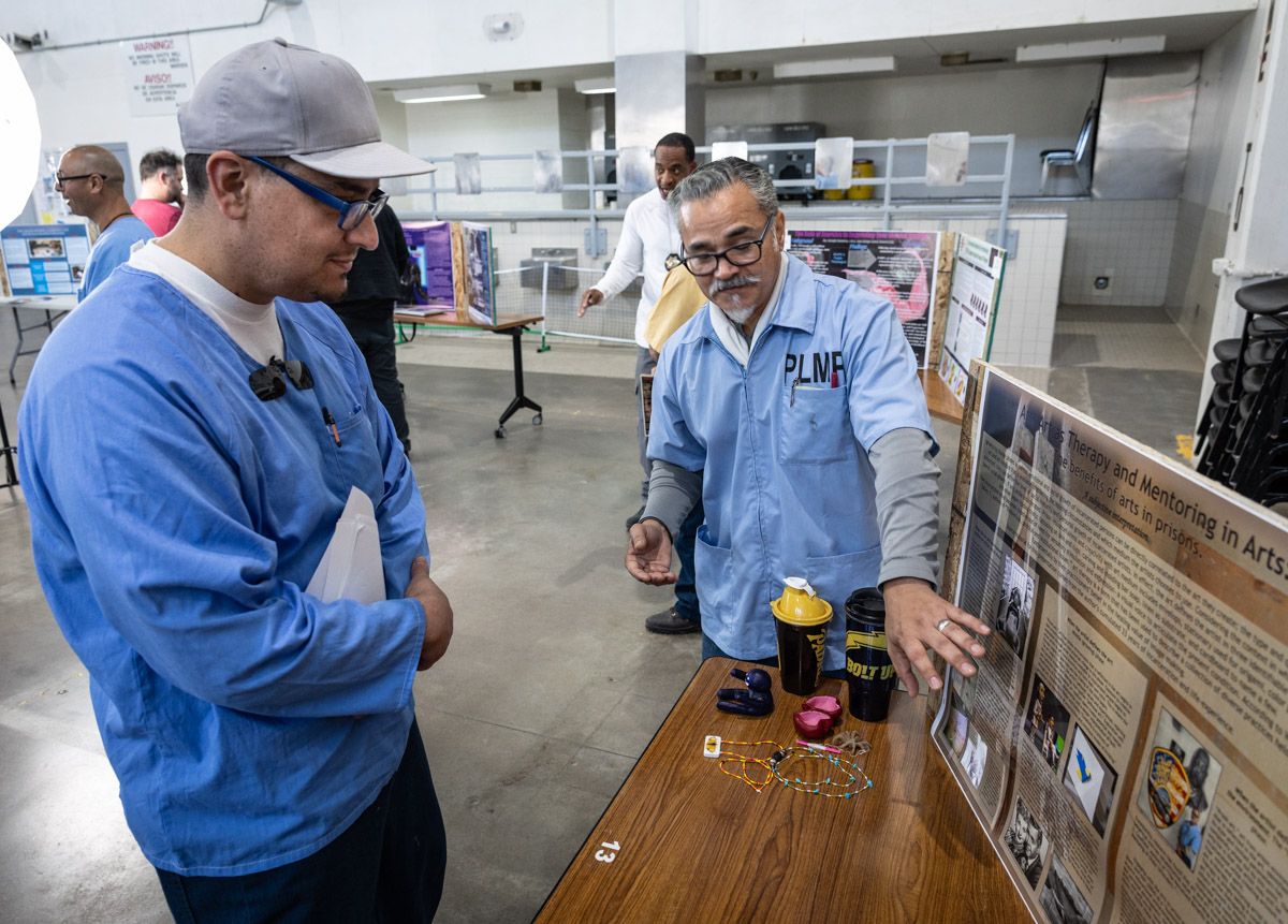 These images are of Open House events on two yards, showcasing the VISTA (Valuing Incarcerated Scholars Through Academia) program run by San Diego State University at Centinela State Prison (CEN); this is a two-year Bachelor of Arts completion degree. Current VISTA students created posters featuring their research studies, and are showing them to men who are interested in joining this program. The existing students also joined a panel discussion, during which they fielded questions about their experiences in the program.