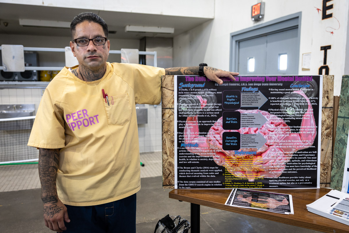 These images are of Open House events on two yards, showcasing the VISTA (Valuing Incarcerated Scholars Through Academia) program run by San Diego State University at Centinela State Prison (CEN); this is a two-year Bachelor of Arts completion degree. Current VISTA students created posters featuring their research studies, and are showing them to men who are interested in joining this program. The existing students also joined a panel discussion, during which they fielded questions about their experiences in the program.