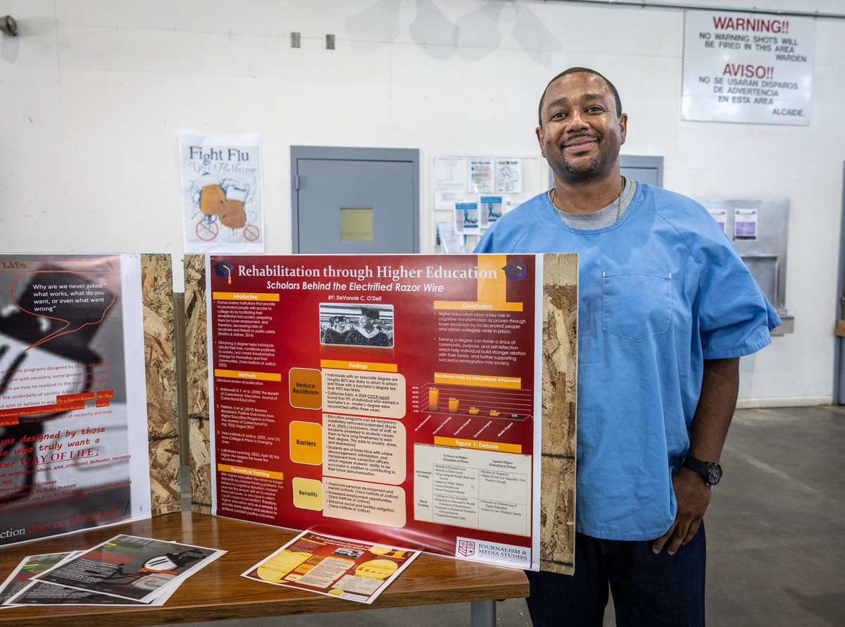 These images are of Open House events on two yards, showcasing the VISTA (Valuing Incarcerated Scholars Through Academia) program run by San Diego State University at Centinela State Prison (CEN); this is a two-year Bachelor of Arts completion degree. Current VISTA students created posters featuring their research studies, and are showing them to men who are interested in joining this program. The existing students also joined a panel discussion, during which they fielded questions about their experiences in the program.