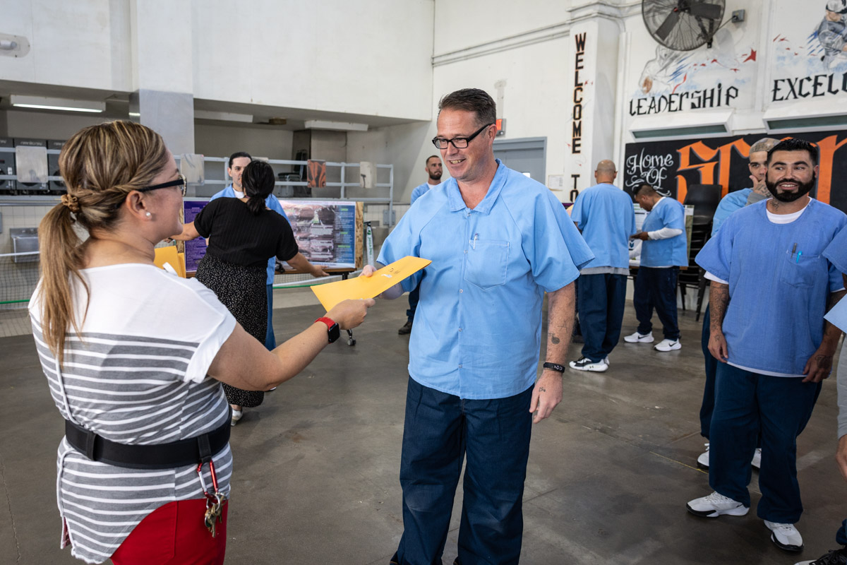 These images are of Open House events on two yards, showcasing the VISTA (Valuing Incarcerated Scholars Through Academia) program run by San Diego State University at Centinela State Prison (CEN); this is a two-year Bachelor of Arts completion degree. Current VISTA students created posters featuring their research studies, and are showing them to men who are interested in joining this program. The existing students also joined a panel discussion, during which they fielded questions about their experiences in the program.