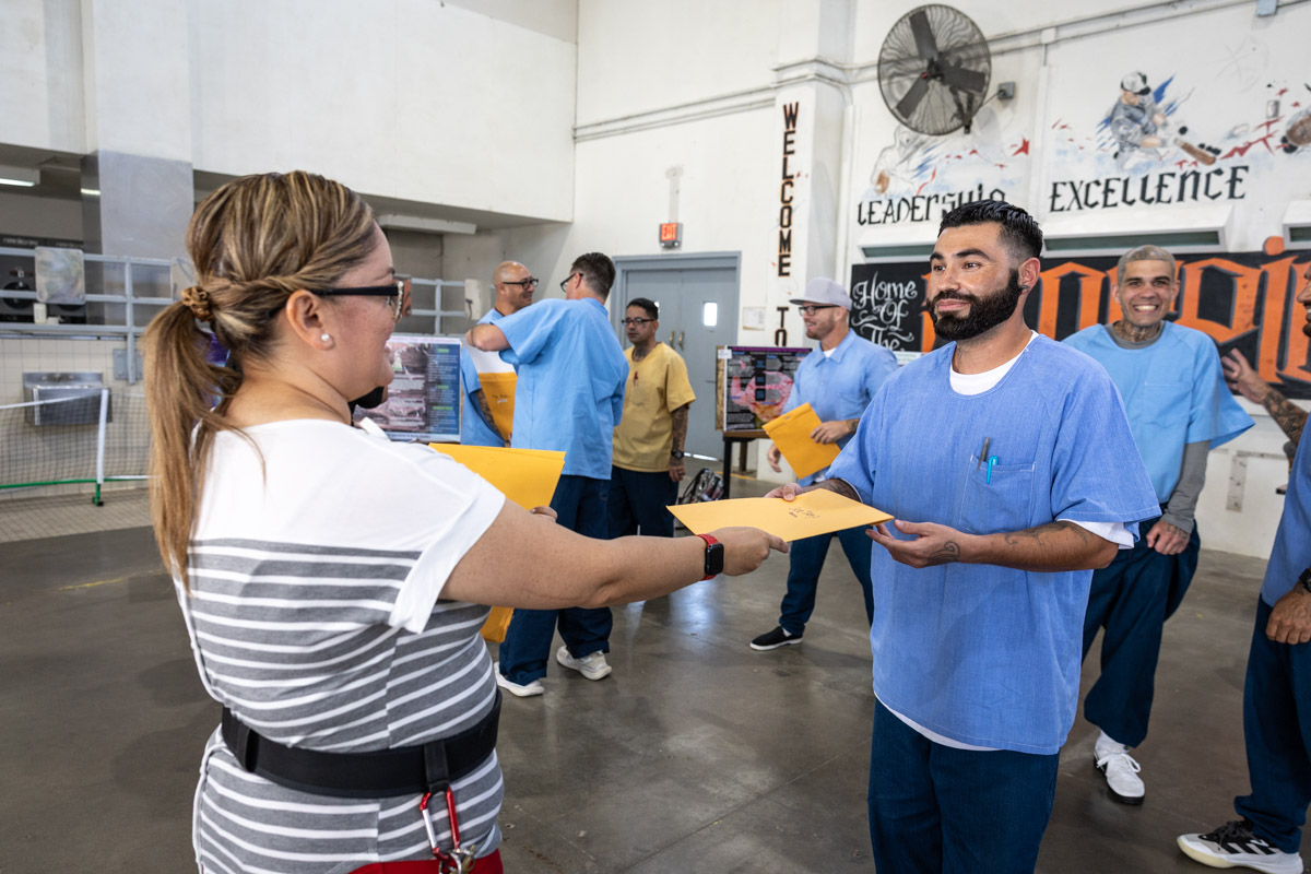 These images are of Open House events on two yards, showcasing the VISTA (Valuing Incarcerated Scholars Through Academia) program run by San Diego State University at Centinela State Prison (CEN); this is a two-year Bachelor of Arts completion degree. Current VISTA students created posters featuring their research studies, and are showing them to men who are interested in joining this program. The existing students also joined a panel discussion, during which they fielded questions about their experiences in the program.