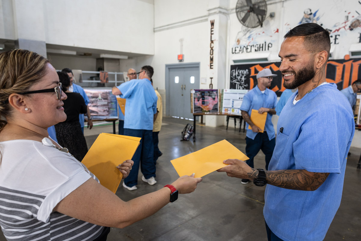 These images are of Open House events on two yards, showcasing the VISTA (Valuing Incarcerated Scholars Through Academia) program run by San Diego State University at Centinela State Prison (CEN); this is a two-year Bachelor of Arts completion degree. Current VISTA students created posters featuring their research studies, and are showing them to men who are interested in joining this program. The existing students also joined a panel discussion, during which they fielded questions about their experiences in the program.