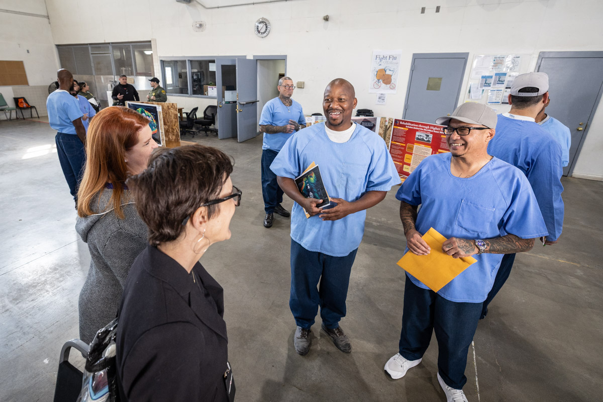 These images are of Open House events on two yards, showcasing the VISTA (Valuing Incarcerated Scholars Through Academia) program run by San Diego State University at Centinela State Prison (CEN); this is a two-year Bachelor of Arts completion degree. Current VISTA students created posters featuring their research studies, and are showing them to men who are interested in joining this program. The existing students also joined a panel discussion, during which they fielded questions about their experiences in the program.