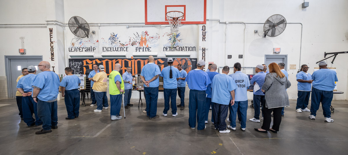 These images are of Open House events on two yards, showcasing the VISTA (Valuing Incarcerated Scholars Through Academia) program run by San Diego State University at Centinela State Prison (CEN); this is a two-year Bachelor of Arts completion degree. Current VISTA students created posters featuring their research studies, and are showing them to men who are interested in joining this program. The existing students also joined a panel discussion, during which they fielded questions about their experiences in the program.