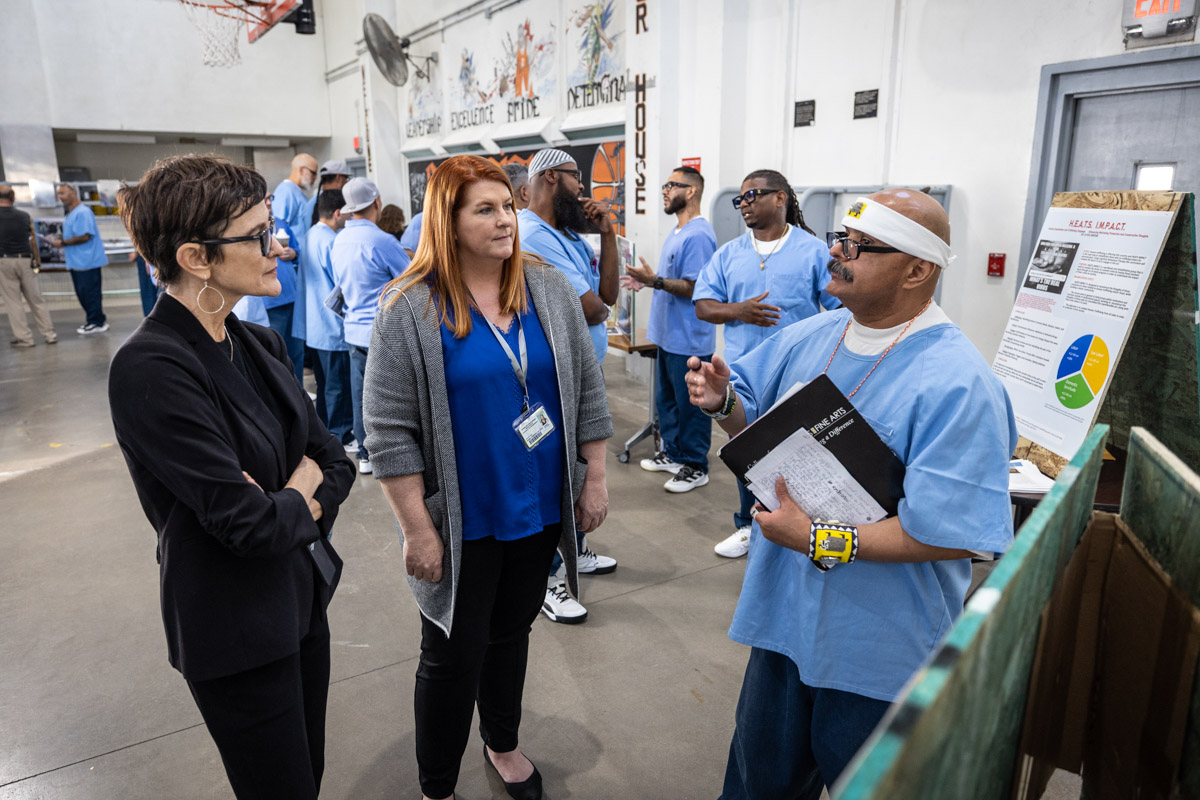 These images are of Open House events on two yards, showcasing the VISTA (Valuing Incarcerated Scholars Through Academia) program run by San Diego State University at Centinela State Prison (CEN); this is a two-year Bachelor of Arts completion degree. Current VISTA students created posters featuring their research studies, and are showing them to men who are interested in joining this program. The existing students also joined a panel discussion, during which they fielded questions about their experiences in the program.