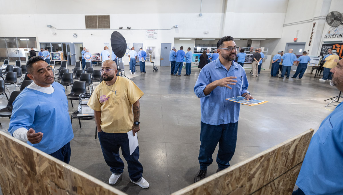 These images are of Open House events on two yards, showcasing the VISTA (Valuing Incarcerated Scholars Through Academia) program run by San Diego State University at Centinela State Prison (CEN); this is a two-year Bachelor of Arts completion degree. Current VISTA students created posters featuring their research studies, and are showing them to men who are interested in joining this program. The existing students also joined a panel discussion, during which they fielded questions about their experiences in the program.