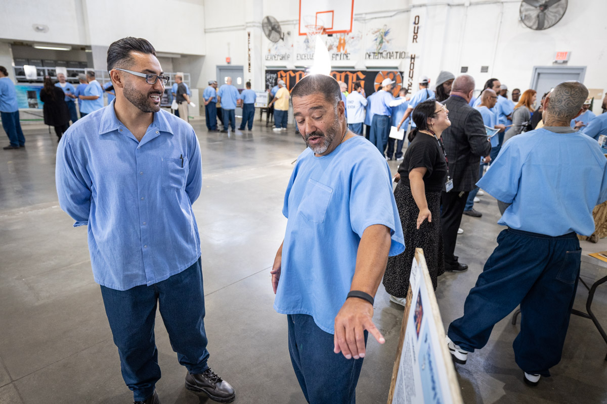 These images are of Open House events on two yards, showcasing the VISTA (Valuing Incarcerated Scholars Through Academia) program run by San Diego State University at Centinela State Prison (CEN); this is a two-year Bachelor of Arts completion degree. Current VISTA students created posters featuring their research studies, and are showing them to men who are interested in joining this program. The existing students also joined a panel discussion, during which they fielded questions about their experiences in the program.