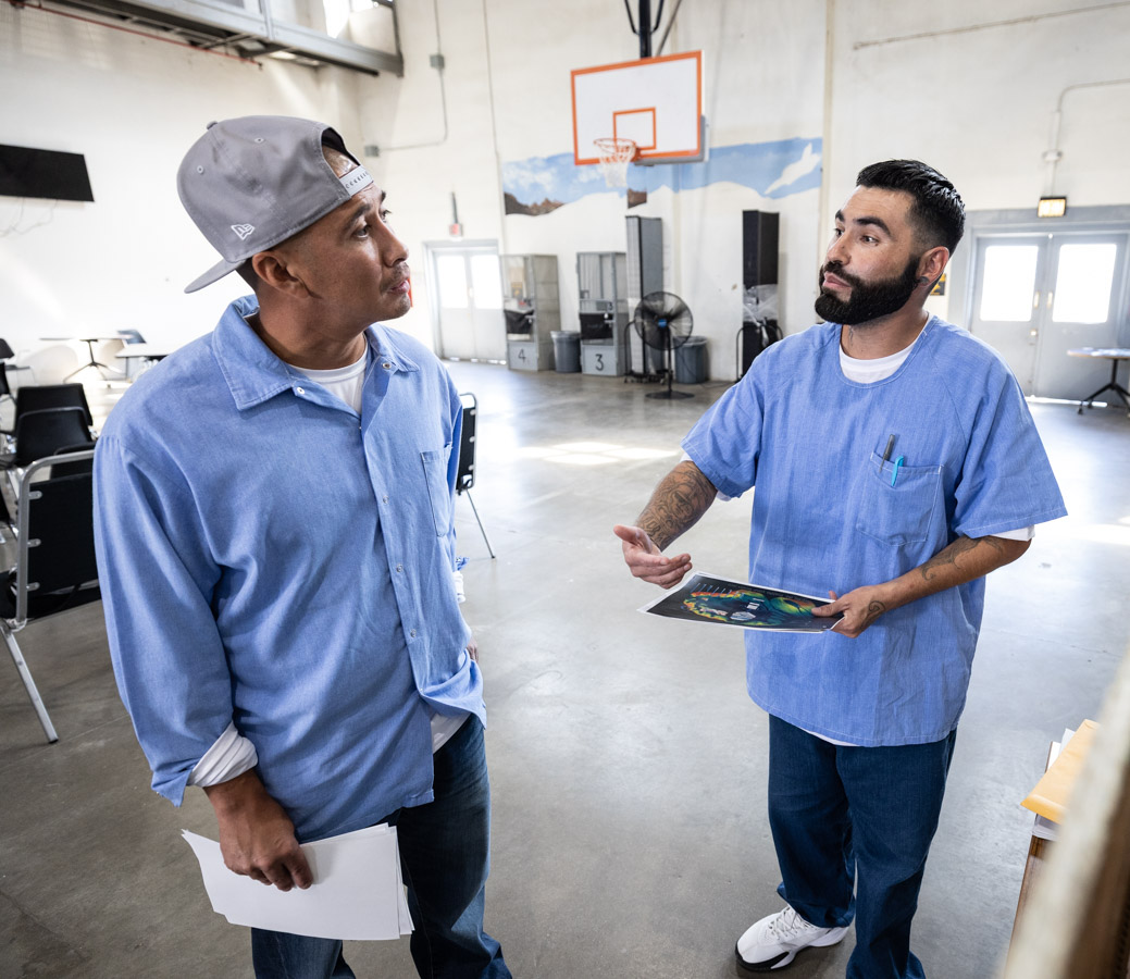These images are of Open House events on two yards, showcasing the VISTA (Valuing Incarcerated Scholars Through Academia) program run by San Diego State University at Centinela State Prison (CEN); this is a two-year Bachelor of Arts completion degree. Current VISTA students created posters featuring their research studies, and are showing them to men who are interested in joining this program. The existing students also joined a panel discussion, during which they fielded questions about their experiences in the program.