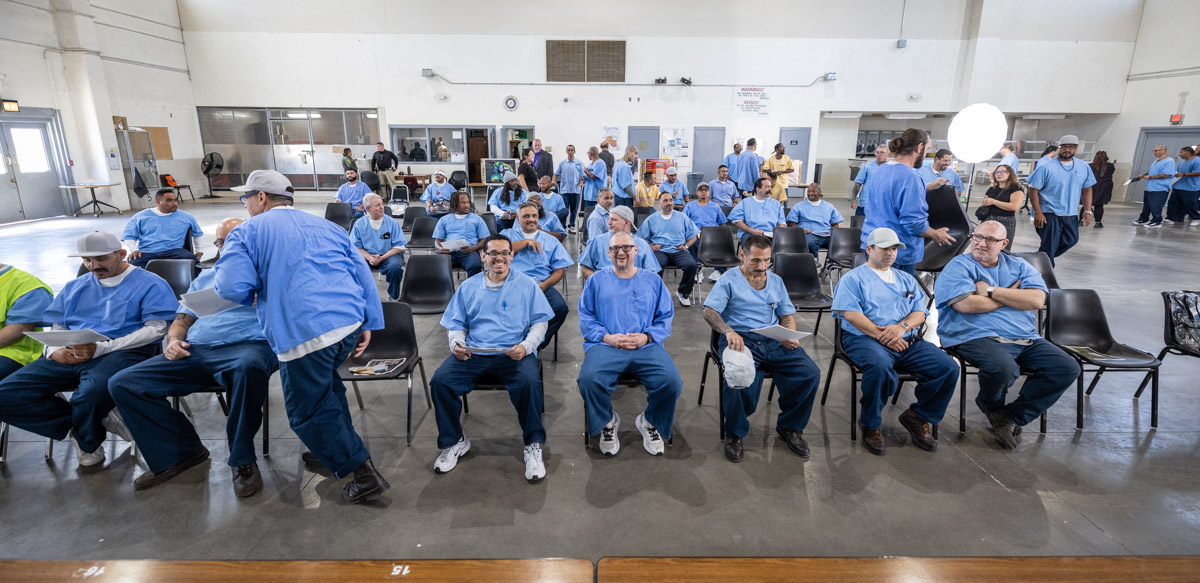 These images are of Open House events on two yards, showcasing the VISTA (Valuing Incarcerated Scholars Through Academia) program run by San Diego State University at Centinela State Prison (CEN); this is a two-year Bachelor of Arts completion degree. Current VISTA students created posters featuring their research studies, and are showing them to men who are interested in joining this program. The existing students also joined a panel discussion, during which they fielded questions about their experiences in the program.