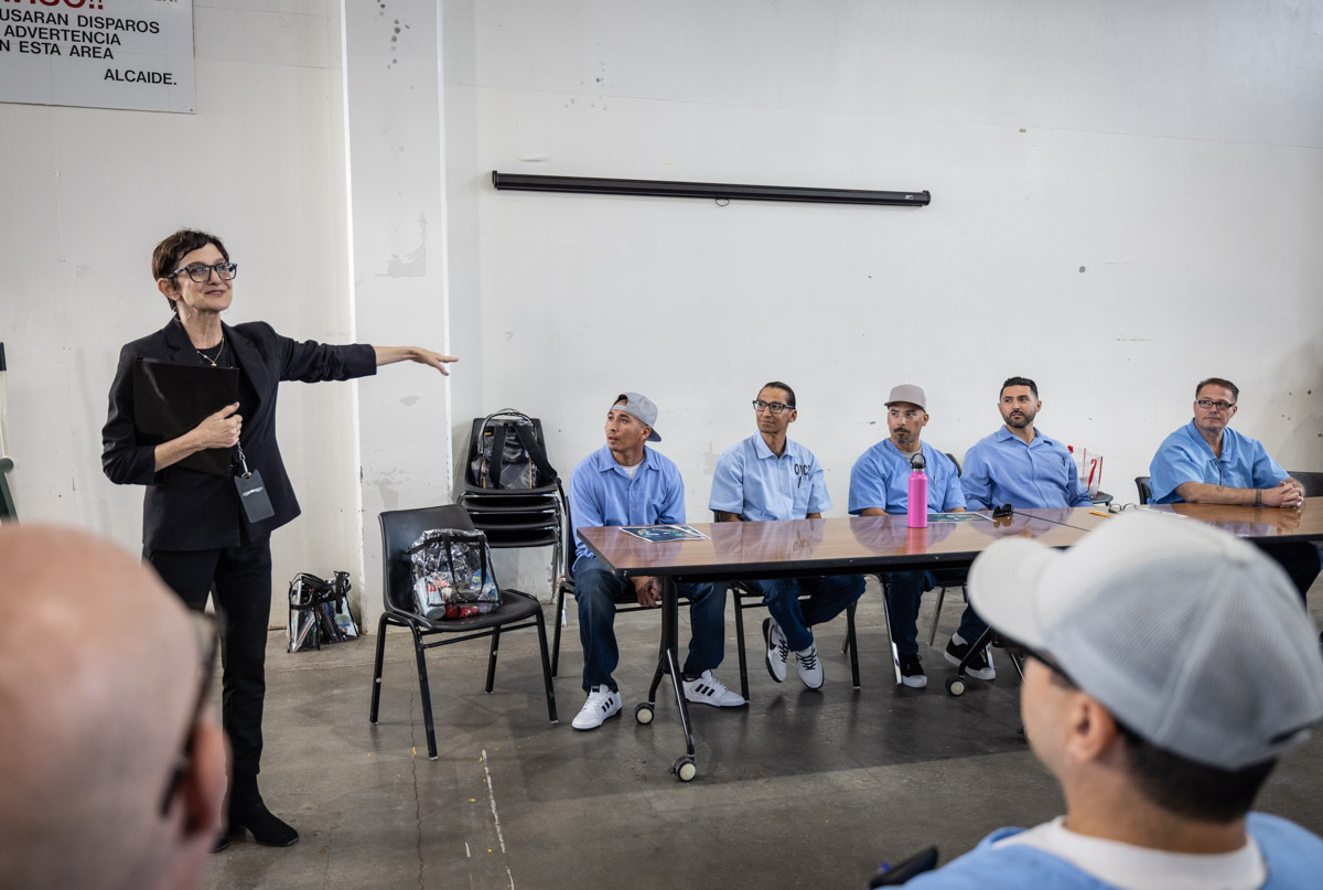 These images are of Open House events on two yards, showcasing the VISTA (Valuing Incarcerated Scholars Through Academia) program run by San Diego State University at Centinela State Prison (CEN); this is a two-year Bachelor of Arts completion degree. Current VISTA students created posters featuring their research studies, and are showing them to men who are interested in joining this program. The existing students also joined a panel discussion, during which they fielded questions about their experiences in the program.