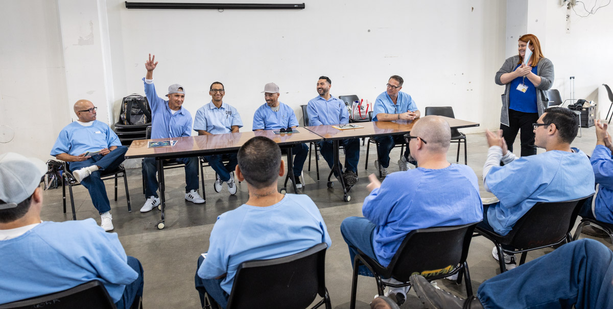 These images are of Open House events on two yards, showcasing the VISTA (Valuing Incarcerated Scholars Through Academia) program run by San Diego State University at Centinela State Prison (CEN); this is a two-year Bachelor of Arts completion degree. Current VISTA students created posters featuring their research studies, and are showing them to men who are interested in joining this program. The existing students also joined a panel discussion, during which they fielded questions about their experiences in the program.