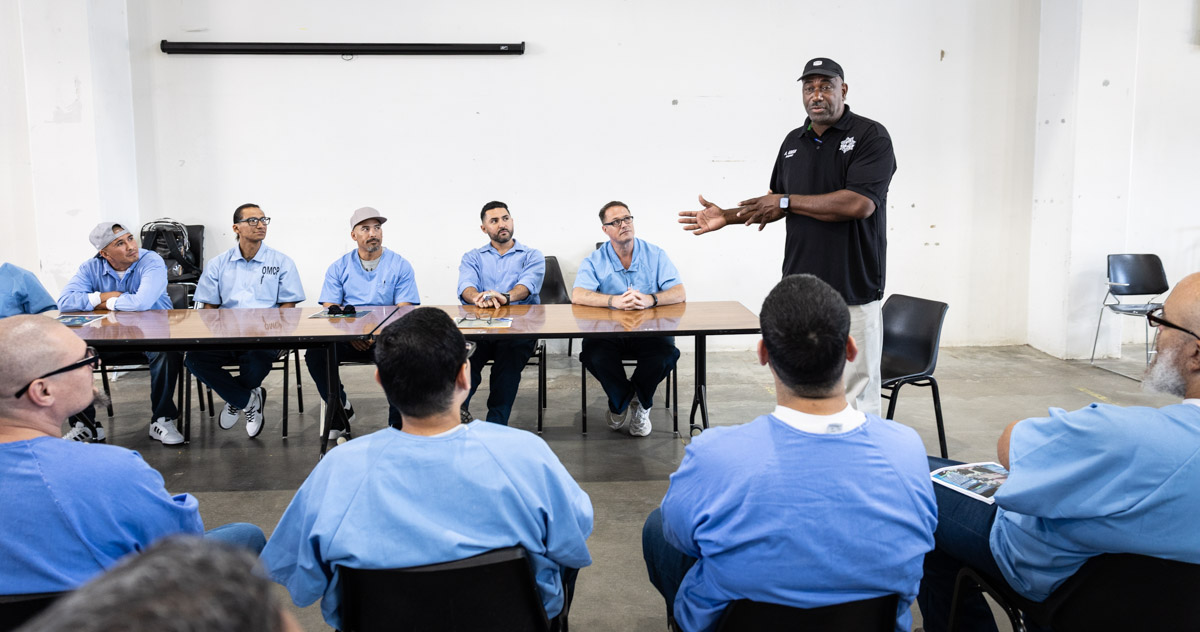 These images are of Open House events on two yards, showcasing the VISTA (Valuing Incarcerated Scholars Through Academia) program run by San Diego State University at Centinela State Prison (CEN); this is a two-year Bachelor of Arts completion degree. Current VISTA students created posters featuring their research studies, and are showing them to men who are interested in joining this program. The existing students also joined a panel discussion, during which they fielded questions about their experiences in the program.