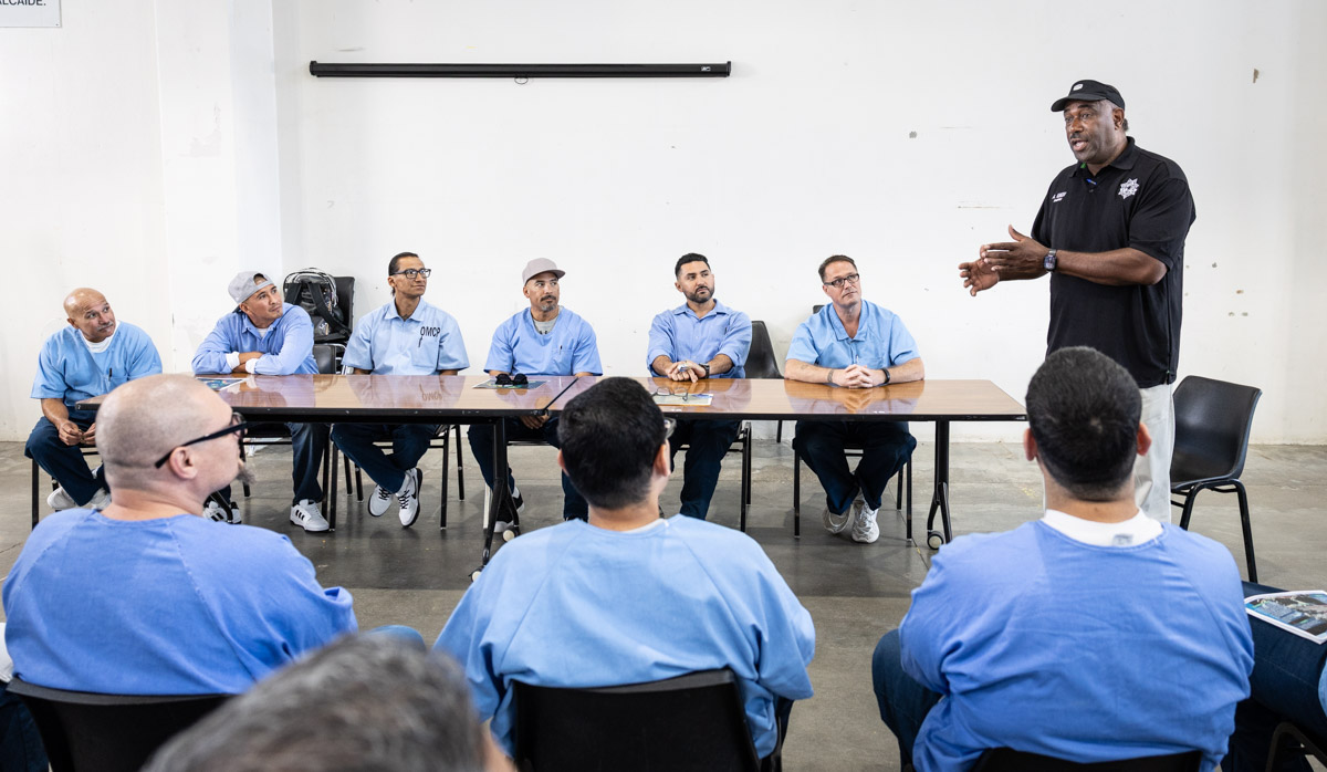 These images are of Open House events on two yards, showcasing the VISTA (Valuing Incarcerated Scholars Through Academia) program run by San Diego State University at Centinela State Prison (CEN); this is a two-year Bachelor of Arts completion degree. Current VISTA students created posters featuring their research studies, and are showing them to men who are interested in joining this program. The existing students also joined a panel discussion, during which they fielded questions about their experiences in the program.