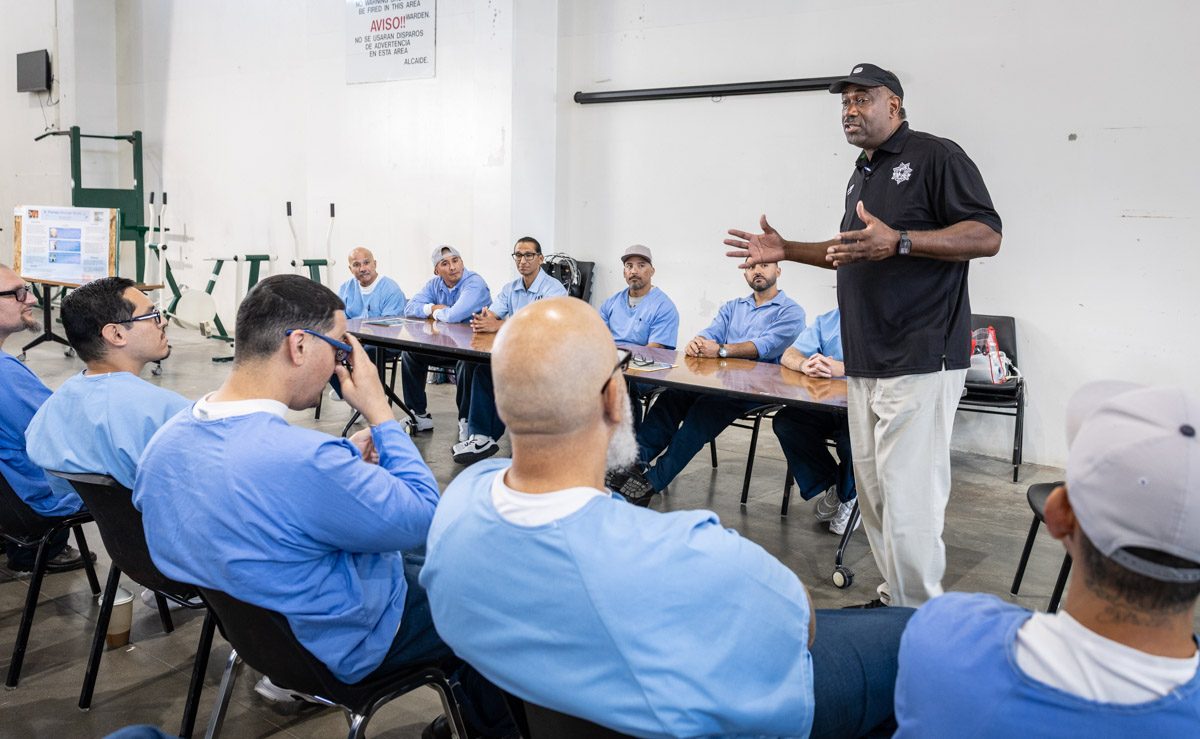 These images are of Open House events on two yards, showcasing the VISTA (Valuing Incarcerated Scholars Through Academia) program run by San Diego State University at Centinela State Prison (CEN); this is a two-year Bachelor of Arts completion degree. Current VISTA students created posters featuring their research studies, and are showing them to men who are interested in joining this program. The existing students also joined a panel discussion, during which they fielded questions about their experiences in the program.
