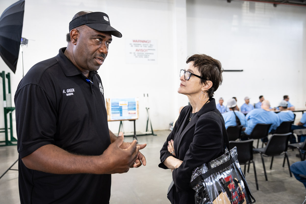 These images are of Open House events on two yards, showcasing the VISTA (Valuing Incarcerated Scholars Through Academia) program run by San Diego State University at Centinela State Prison (CEN); this is a two-year Bachelor of Arts completion degree. Current VISTA students created posters featuring their research studies, and are showing them to men who are interested in joining this program. The existing students also joined a panel discussion, during which they fielded questions about their experiences in the program.