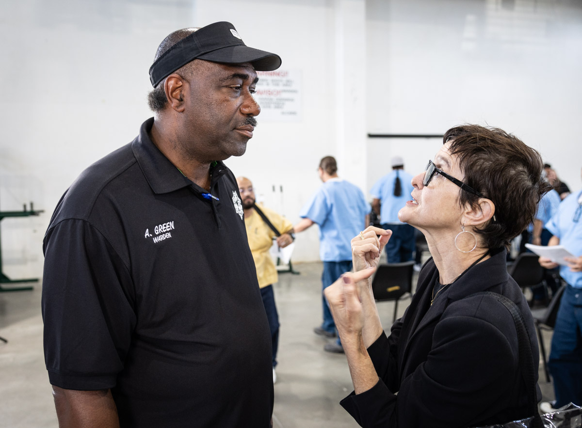 These images are of Open House events on two yards, showcasing the VISTA (Valuing Incarcerated Scholars Through Academia) program run by San Diego State University at Centinela State Prison (CEN); this is a two-year Bachelor of Arts completion degree. Current VISTA students created posters featuring their research studies, and are showing them to men who are interested in joining this program. The existing students also joined a panel discussion, during which they fielded questions about their experiences in the program.