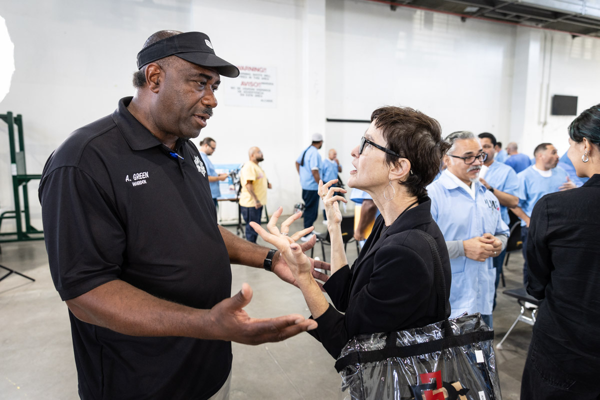 These images are of Open House events on two yards, showcasing the VISTA (Valuing Incarcerated Scholars Through Academia) program run by San Diego State University at Centinela State Prison (CEN); this is a two-year Bachelor of Arts completion degree. Current VISTA students created posters featuring their research studies, and are showing them to men who are interested in joining this program. The existing students also joined a panel discussion, during which they fielded questions about their experiences in the program.