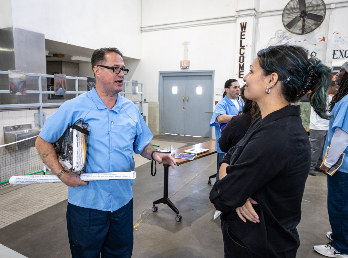 These images are of Open House events on two yards, showcasing the VISTA (Valuing Incarcerated Scholars Through Academia) program run by San Diego State University at Centinela State Prison (CEN); this is a two-year Bachelor of Arts completion degree. Current VISTA students created posters featuring their research studies, and are showing them to men who are interested in joining this program. The existing students also joined a panel discussion, during which they fielded questions about their experiences in the program.