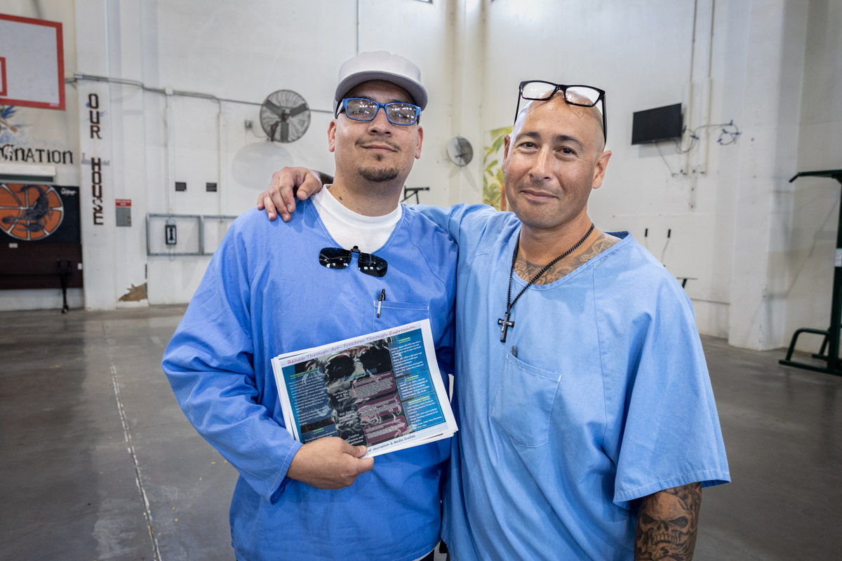 These images are of Open House events on two yards, showcasing the VISTA (Valuing Incarcerated Scholars Through Academia) program run by San Diego State University at Centinela State Prison (CEN); this is a two-year Bachelor of Arts completion degree. Current VISTA students created posters featuring their research studies, and are showing them to men who are interested in joining this program. The existing students also joined a panel discussion, during which they fielded questions about their experiences in the program.