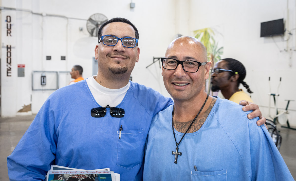 These images are of Open House events on two yards, showcasing the VISTA (Valuing Incarcerated Scholars Through Academia) program run by San Diego State University at Centinela State Prison (CEN); this is a two-year Bachelor of Arts completion degree. Current VISTA students created posters featuring their research studies, and are showing them to men who are interested in joining this program. The existing students also joined a panel discussion, during which they fielded questions about their experiences in the program.