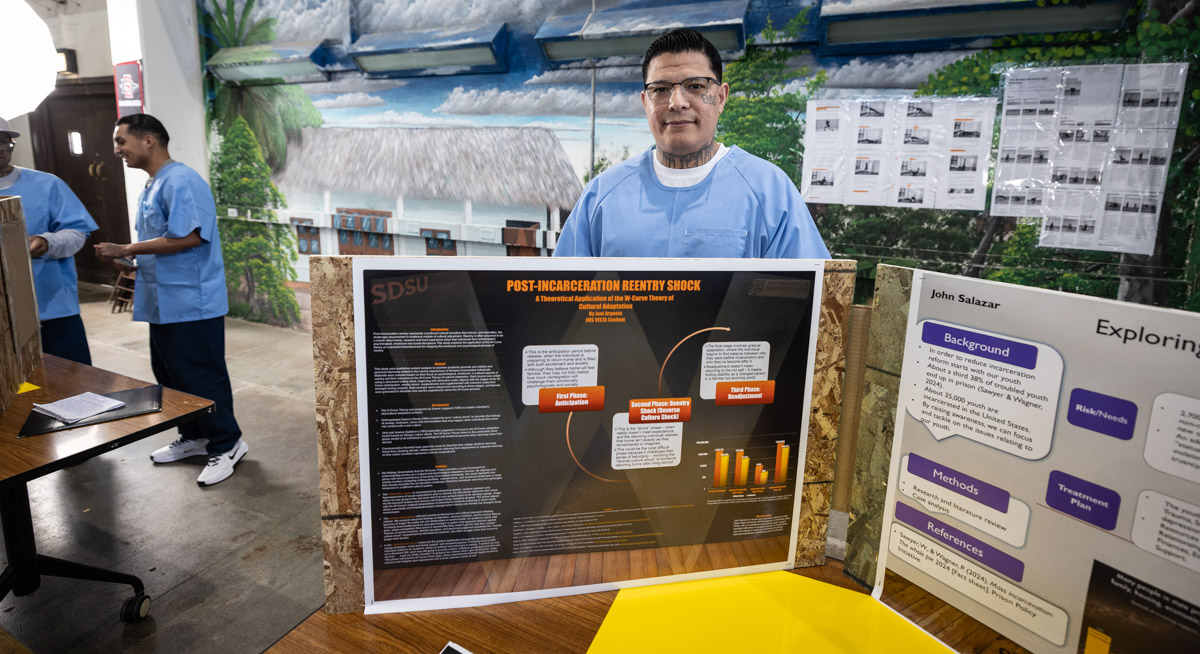 These images are of Open House events on two yards, showcasing the VISTA (Valuing Incarcerated Scholars Through Academia) program run by San Diego State University at Centinela State Prison (CEN); this is a two-year Bachelor of Arts completion degree. Current VISTA students created posters featuring their research studies, and are showing them to men who are interested in joining this program. The existing students also joined a panel discussion, during which they fielded questions about their experiences in the program.