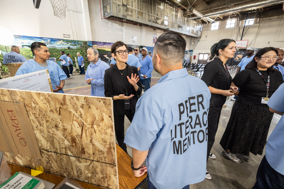 These images are of Open House events on two yards, showcasing the VISTA (Valuing Incarcerated Scholars Through Academia) program run by San Diego State University at Centinela State Prison (CEN); this is a two-year Bachelor of Arts completion degree. Current VISTA students created posters featuring their research studies, and are showing them to men who are interested in joining this program. The existing students also joined a panel discussion, during which they fielded questions about their experiences in the program.
