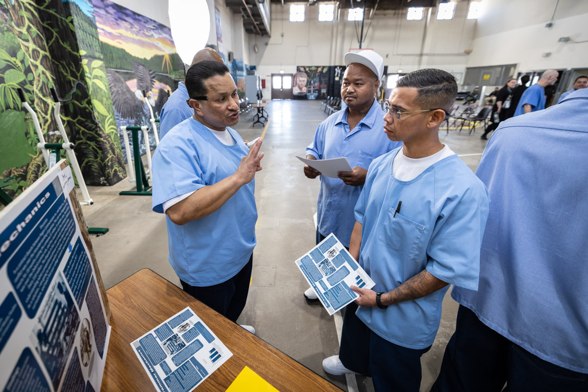These images are of Open House events on two yards, showcasing the VISTA (Valuing Incarcerated Scholars Through Academia) program run by San Diego State University at Centinela State Prison (CEN); this is a two-year Bachelor of Arts completion degree. Current VISTA students created posters featuring their research studies, and are showing them to men who are interested in joining this program. The existing students also joined a panel discussion, during which they fielded questions about their experiences in the program.