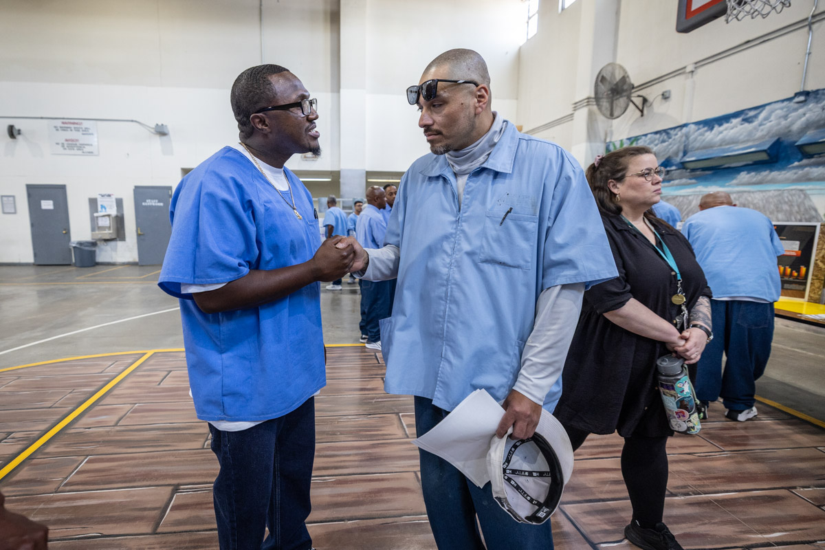 These images are of Open House events on two yards, showcasing the VISTA (Valuing Incarcerated Scholars Through Academia) program run by San Diego State University at Centinela State Prison (CEN); this is a two-year Bachelor of Arts completion degree. Current VISTA students created posters featuring their research studies, and are showing them to men who are interested in joining this program. The existing students also joined a panel discussion, during which they fielded questions about their experiences in the program.