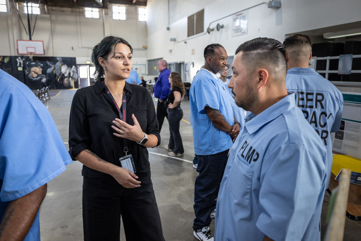 These images are of Open House events on two yards, showcasing the VISTA (Valuing Incarcerated Scholars Through Academia) program run by San Diego State University at Centinela State Prison (CEN); this is a two-year Bachelor of Arts completion degree. Current VISTA students created posters featuring their research studies, and are showing them to men who are interested in joining this program. The existing students also joined a panel discussion, during which they fielded questions about their experiences in the program.