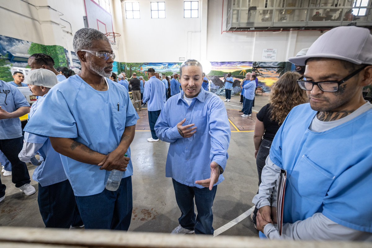 These images are of Open House events on two yards, showcasing the VISTA (Valuing Incarcerated Scholars Through Academia) program run by San Diego State University at Centinela State Prison (CEN); this is a two-year Bachelor of Arts completion degree. Current VISTA students created posters featuring their research studies, and are showing them to men who are interested in joining this program. The existing students also joined a panel discussion, during which they fielded questions about their experiences in the program.