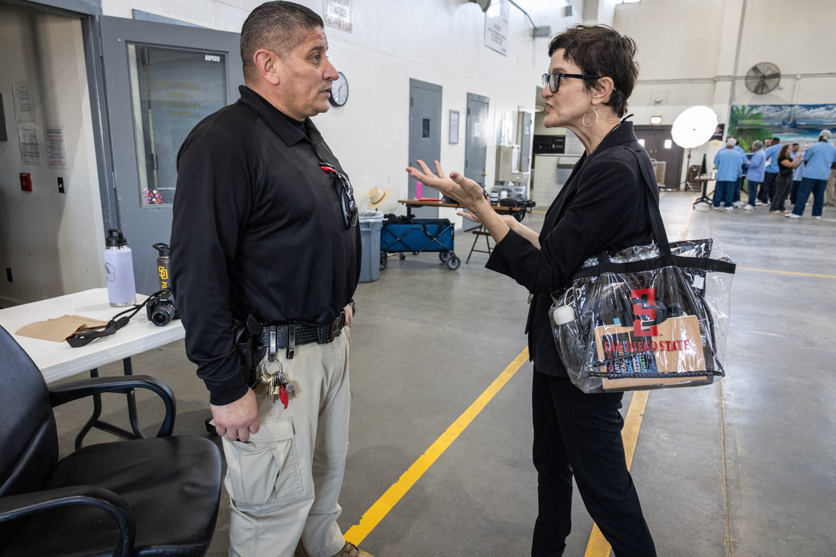 These images are of Open House events on two yards, showcasing the VISTA (Valuing Incarcerated Scholars Through Academia) program run by San Diego State University at Centinela State Prison (CEN); this is a two-year Bachelor of Arts completion degree. Current VISTA students created posters featuring their research studies, and are showing them to men who are interested in joining this program. The existing students also joined a panel discussion, during which they fielded questions about their experiences in the program.