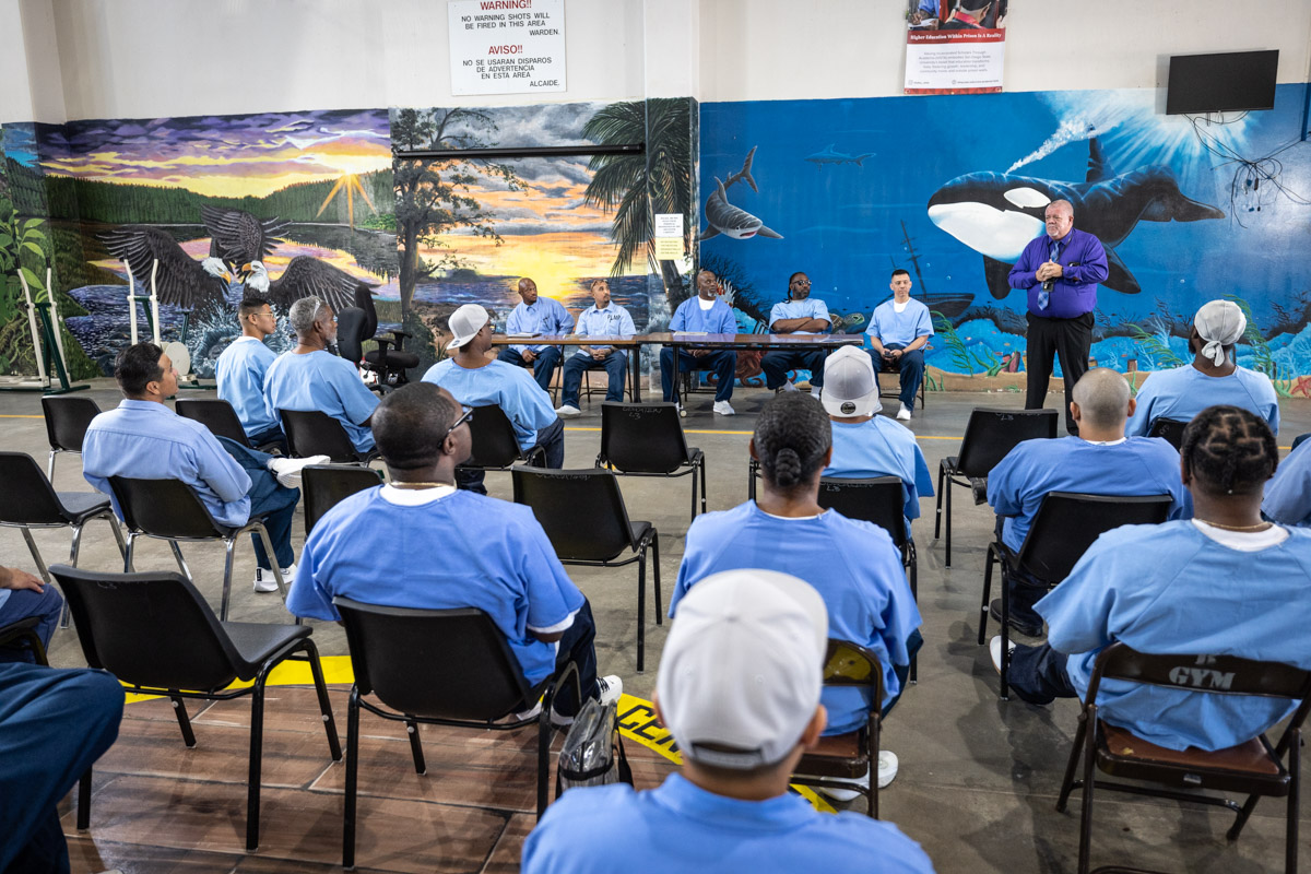 These images are of Open House events on two yards, showcasing the VISTA (Valuing Incarcerated Scholars Through Academia) program run by San Diego State University at Centinela State Prison (CEN); this is a two-year Bachelor of Arts completion degree. Current VISTA students created posters featuring their research studies, and are showing them to men who are interested in joining this program. The existing students also joined a panel discussion, during which they fielded questions about their experiences in the program.