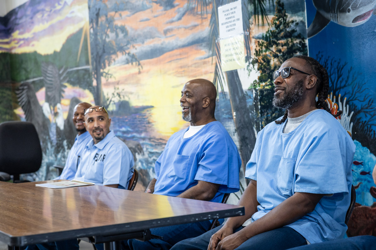These images are of Open House events on two yards, showcasing the VISTA (Valuing Incarcerated Scholars Through Academia) program run by San Diego State University at Centinela State Prison (CEN); this is a two-year Bachelor of Arts completion degree. Current VISTA students created posters featuring their research studies, and are showing them to men who are interested in joining this program. The existing students also joined a panel discussion, during which they fielded questions about their experiences in the program.