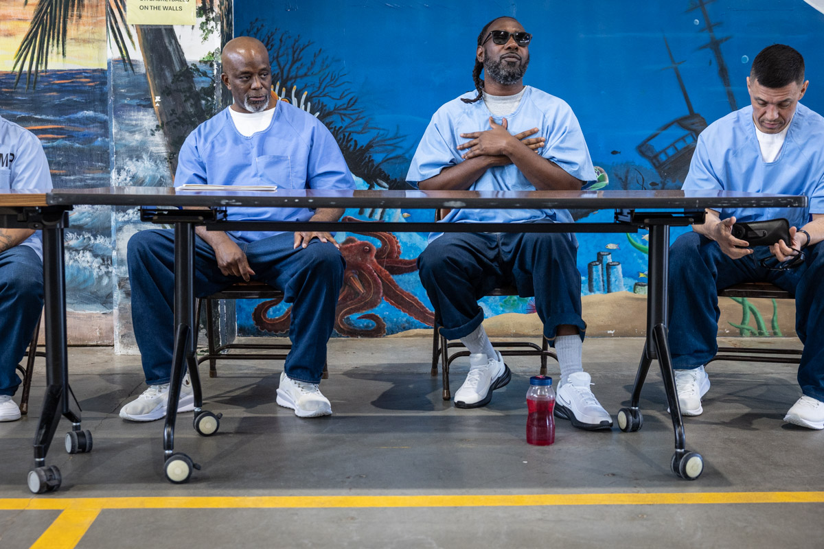 These images are of Open House events on two yards, showcasing the VISTA (Valuing Incarcerated Scholars Through Academia) program run by San Diego State University at Centinela State Prison (CEN); this is a two-year Bachelor of Arts completion degree. Current VISTA students created posters featuring their research studies, and are showing them to men who are interested in joining this program. The existing students also joined a panel discussion, during which they fielded questions about their experiences in the program.