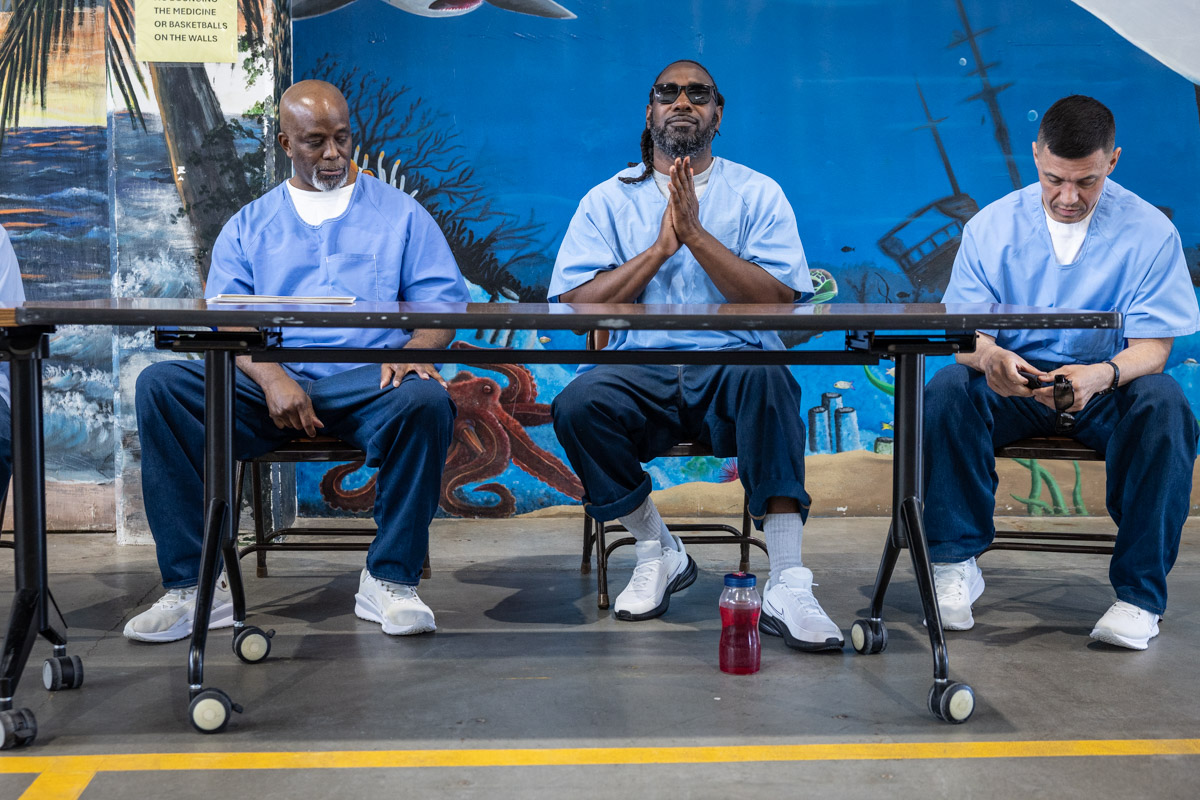 These images are of Open House events on two yards, showcasing the VISTA (Valuing Incarcerated Scholars Through Academia) program run by San Diego State University at Centinela State Prison (CEN); this is a two-year Bachelor of Arts completion degree. Current VISTA students created posters featuring their research studies, and are showing them to men who are interested in joining this program. The existing students also joined a panel discussion, during which they fielded questions about their experiences in the program.