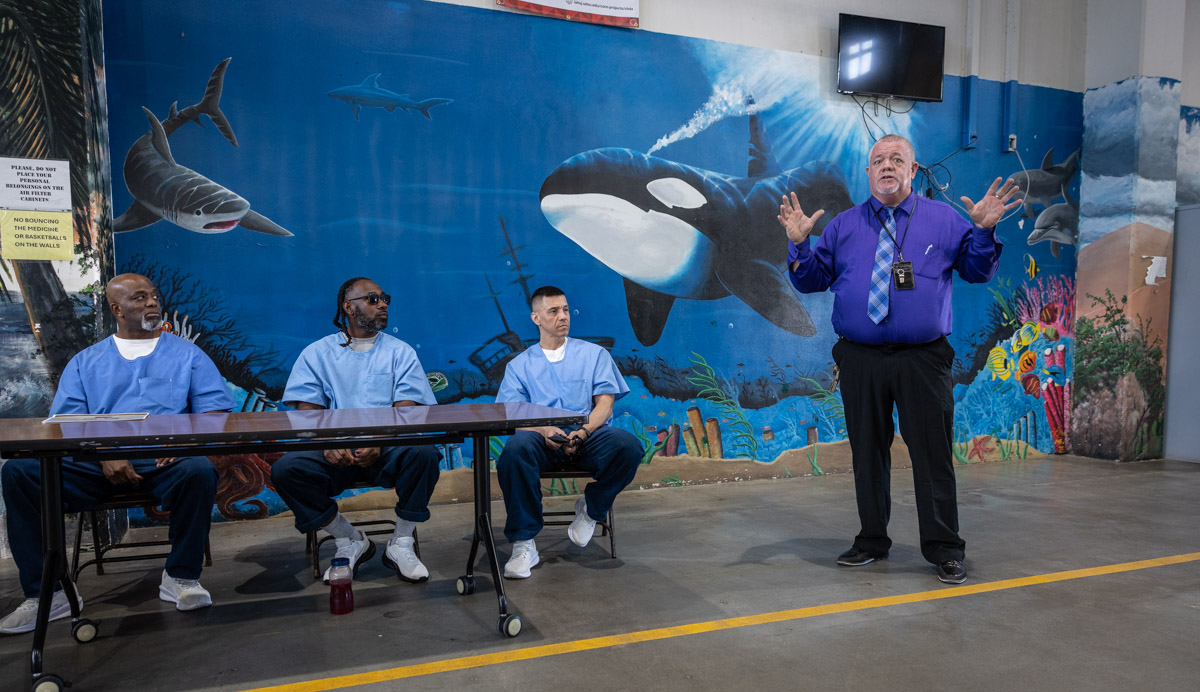 These images are of Open House events on two yards, showcasing the VISTA (Valuing Incarcerated Scholars Through Academia) program run by San Diego State University at Centinela State Prison (CEN); this is a two-year Bachelor of Arts completion degree. Current VISTA students created posters featuring their research studies, and are showing them to men who are interested in joining this program. The existing students also joined a panel discussion, during which they fielded questions about their experiences in the program.