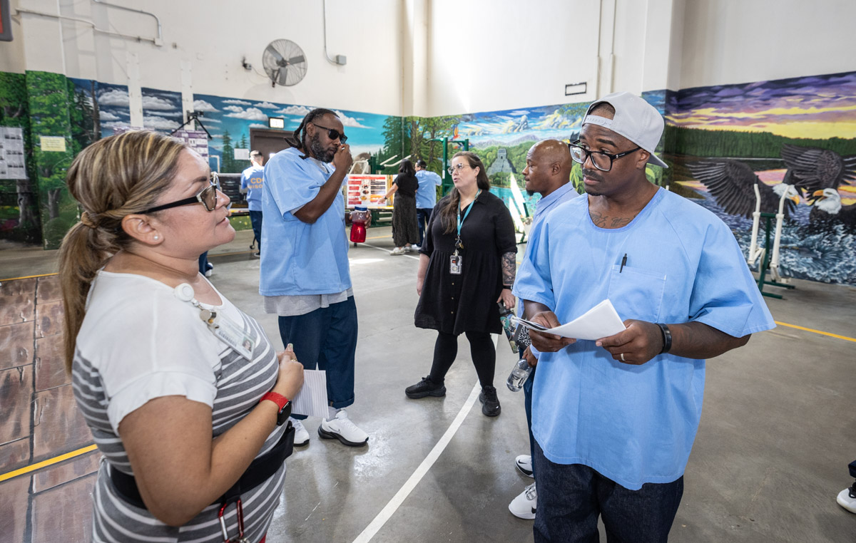 These images are of Open House events on two yards, showcasing the VISTA (Valuing Incarcerated Scholars Through Academia) program run by San Diego State University at Centinela State Prison (CEN); this is a two-year Bachelor of Arts completion degree. Current VISTA students created posters featuring their research studies, and are showing them to men who are interested in joining this program. The existing students also joined a panel discussion, during which they fielded questions about their experiences in the program.