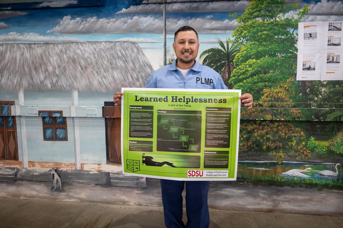 These images are of Open House events on two yards, showcasing the VISTA (Valuing Incarcerated Scholars Through Academia) program run by San Diego State University at Centinela State Prison (CEN); this is a two-year Bachelor of Arts completion degree. Current VISTA students created posters featuring their research studies, and are showing them to men who are interested in joining this program. The existing students also joined a panel discussion, during which they fielded questions about their experiences in the program.
