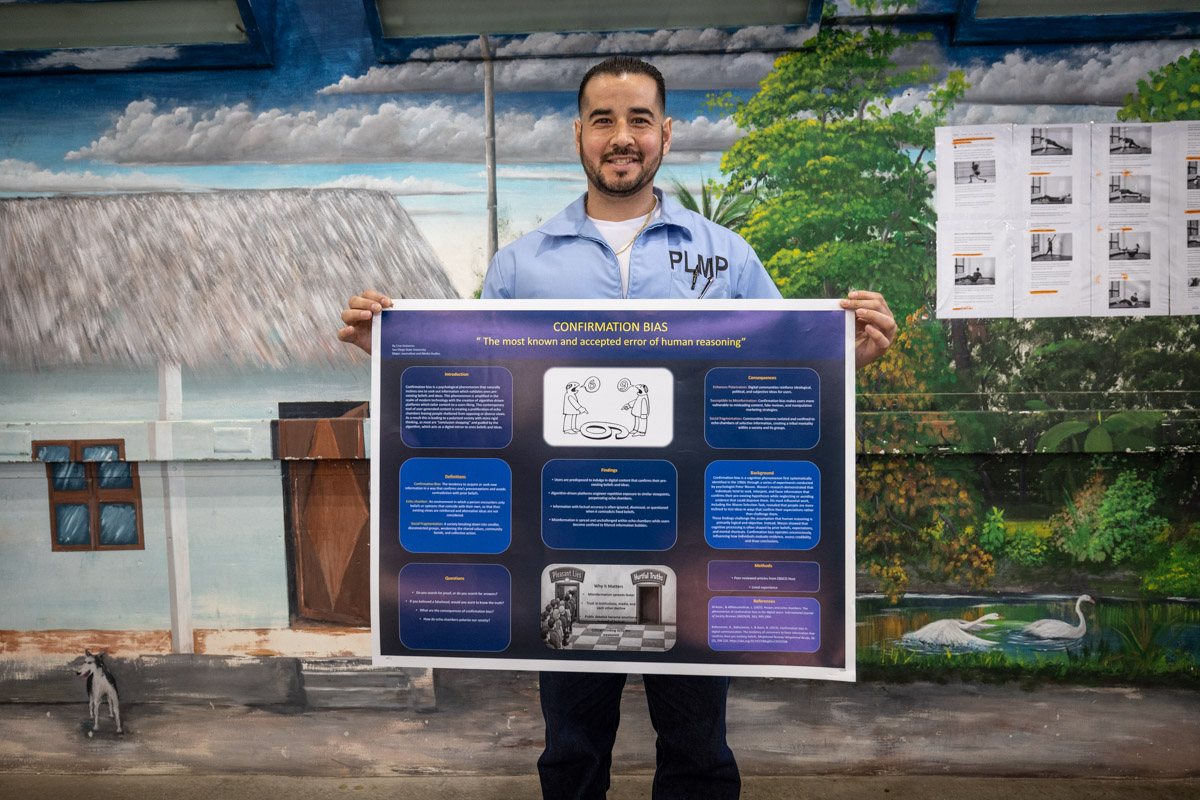 These images are of Open House events on two yards, showcasing the VISTA (Valuing Incarcerated Scholars Through Academia) program run by San Diego State University at Centinela State Prison (CEN); this is a two-year Bachelor of Arts completion degree. Current VISTA students created posters featuring their research studies, and are showing them to men who are interested in joining this program. The existing students also joined a panel discussion, during which they fielded questions about their experiences in the program.